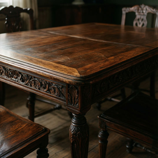 Restauro de uma mesa antiga, preservando suas características originais enquanto adicionava durabilidade e resistência. Trabalho artesanal que valorizou a história do móvel.